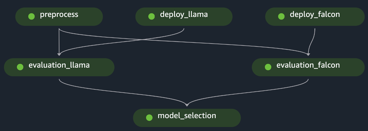 To accelerate your journey into LLM evaluation at scale, we created a solution that implements the scenarios using both Amazon SageMaker Clarify and the new Amazon SageMaker Pipelines SDK. The code example, including datasets, source notebooks and SageMaker Pipelines (steps and ML pipeline), is available on GitHub. To develop this example solution, we have used two FMs: Llama2 and Falcon-7B. In this post, our primary focus is on the key elements of the SageMaker Pipeline solution that pertain to the evaluation process.