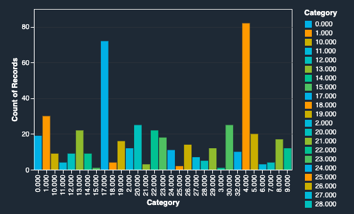 In the following chart, on the x-axis we have the class label, where we have converted the category of the book to a number. The y-axis shows the count of each class label. The chart shows the class distribution of the data. You can see that categories 4.000 and 17.000 far outnumber the other classes. Even with the best algorithm, you will struggle to get good performance because of the large imbalance.