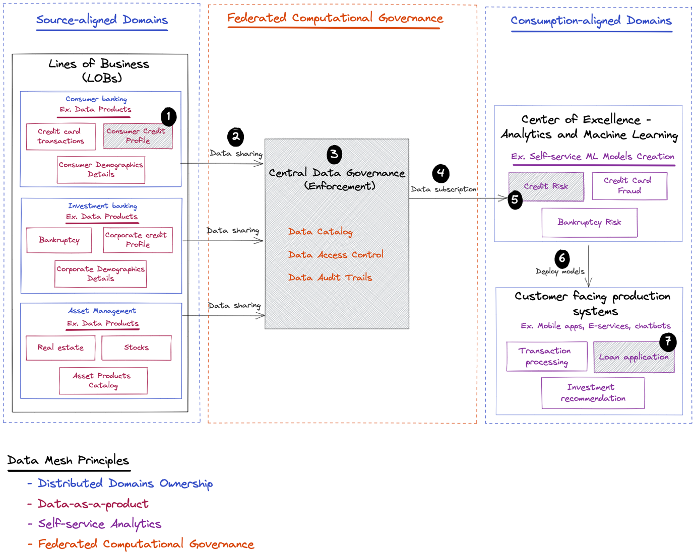 - First, we focused on the organizational part associated with distributed domain ownership and data as a product principles. The authors described the vision of aligning multiple LOBs across the organization towards a data product strategy that provides the consumption-aligned domains with tools to find and obtain the data they need, while guaranteeing the necessary control around the use of that data by introducing accountability for the source-aligned domains to provide data products ready to be used right at the source. For more information, refer to How JPMorgan Chase built a data mesh architecture to drive significant value to enhance their enterprise data platform.