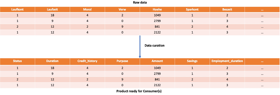 For example, while preparing the consumer credit profile data product, the consumer banking domain data team can make a simple curation to translate from German to English the attribute names of the raw data retrieved from the open-source dataset Statlog German credit data, which consists of 20 attributes and 1,000 rows.