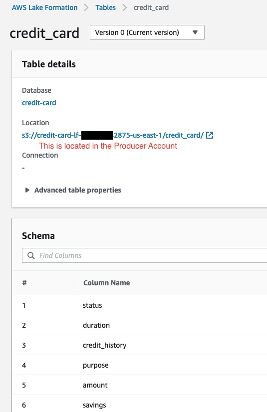 rl_credit-card) using an AWS Glue crawler in the producer account.