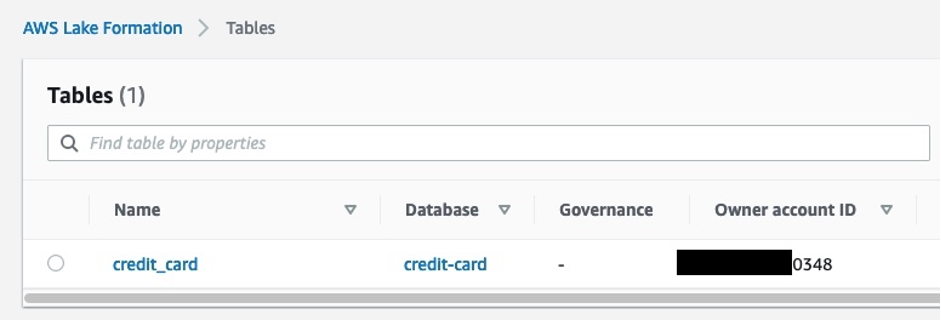 The created table automatically appears in the central governance account. The following screenshot shows an example of the table in Lake Formation in the central account. This is after performing the earlier steps to populate the resource link database rl_credit-card in the producer account.