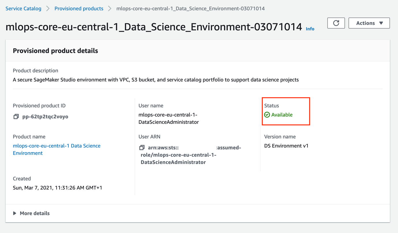 Wait until AWS Service Catalog finishes provisioning the data science environment stack and the product status becomes Available. The data science environment provisioning takes about 20 minutes to complete.