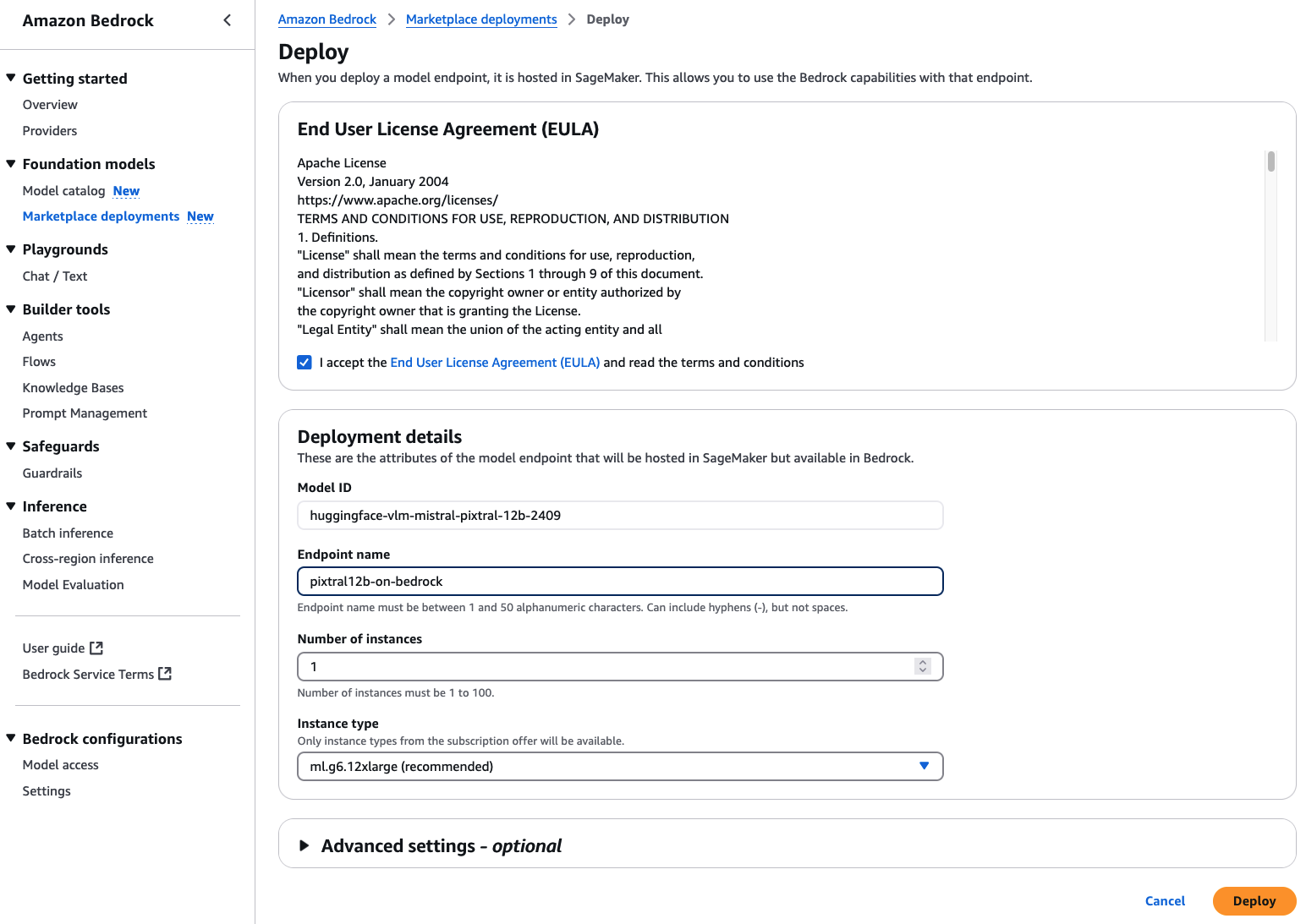 You will be prompted to configure the deployment details for Pixtral 12B. The model ID will be prepopulated.