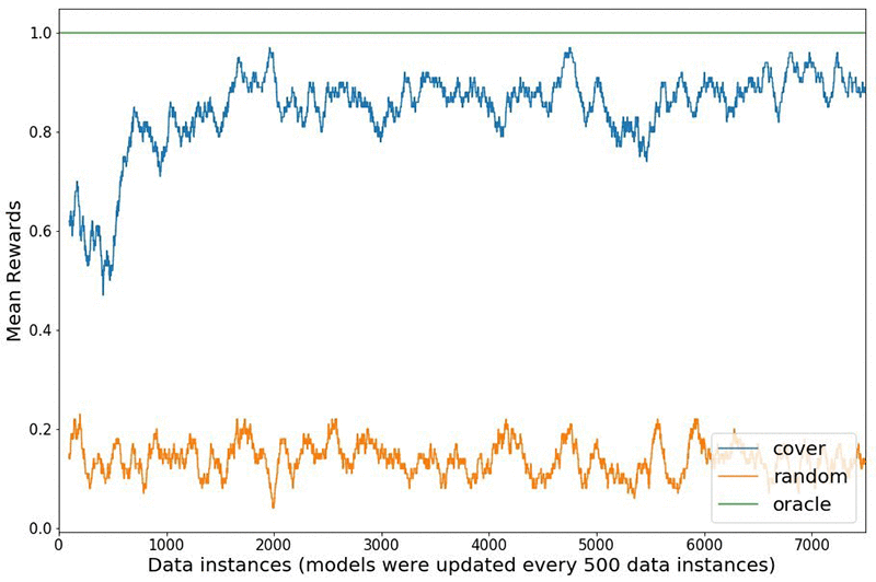 We compare the rewards received in the Statlog (Shuttle) simulated environment between using a naive random strategy to explore the environment versus a bandit algorithm called online cover [3]. The figure below shows how the bandit algorithm explores different actions initially, learns from the received rewards and shifts to exploiting as time progresses. The agent receives a reward of one if the predicted action is the correct class and zero otherwise. The oracle always knows the right action to take for each state, and gets a perfect score of one. The experiment starts with a model warm started from 100 data points and updates the model every 500 interactions for a total of 7500 interactions. The rewards shown are a rolling mean over 100 data points. The rewards plot aligns with results reported in the literature [4].