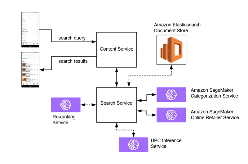 In one view, below is the architecture of our ML-enhanced search services architecture. As you’ll see, the querying and retrieval mechanism described above (and captured here as well) is complemented by SageMaker, which provides two distinct value-adds. First, it enables us to categorize the search query to deliver more relevant results, and second, it enables us to provide online retailers whose offerings are relevant to the query.