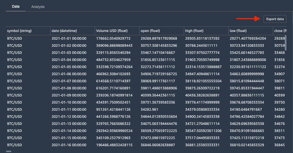 Download the Bitstamp_BTCUSD_2021_minute.csv file from cryptodatadownload and upload it to Amazon Simple Storage Service (Amazon S3).