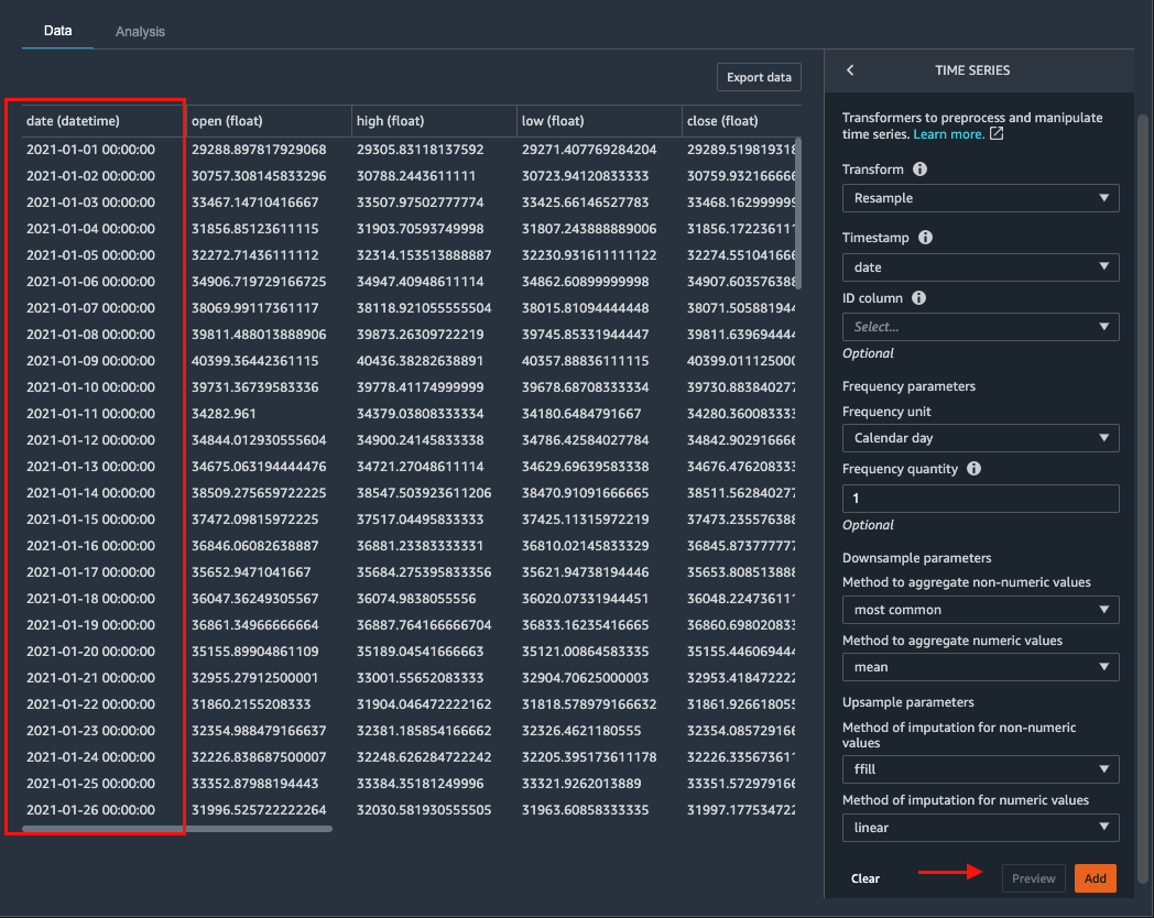 Data Wrangler provides a no-code/low-code solution to time series analysis with features to clean, transform, and prepare data faster. It also enables data scientists to prepare time series data in adherence to their forecasting model’s input format requirements. The following are a few ways you can use these capabilities: