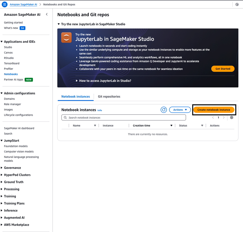 From the SageMaker AI landing page, choose Notebook instances in the left panel and choose Create notebook Instance.