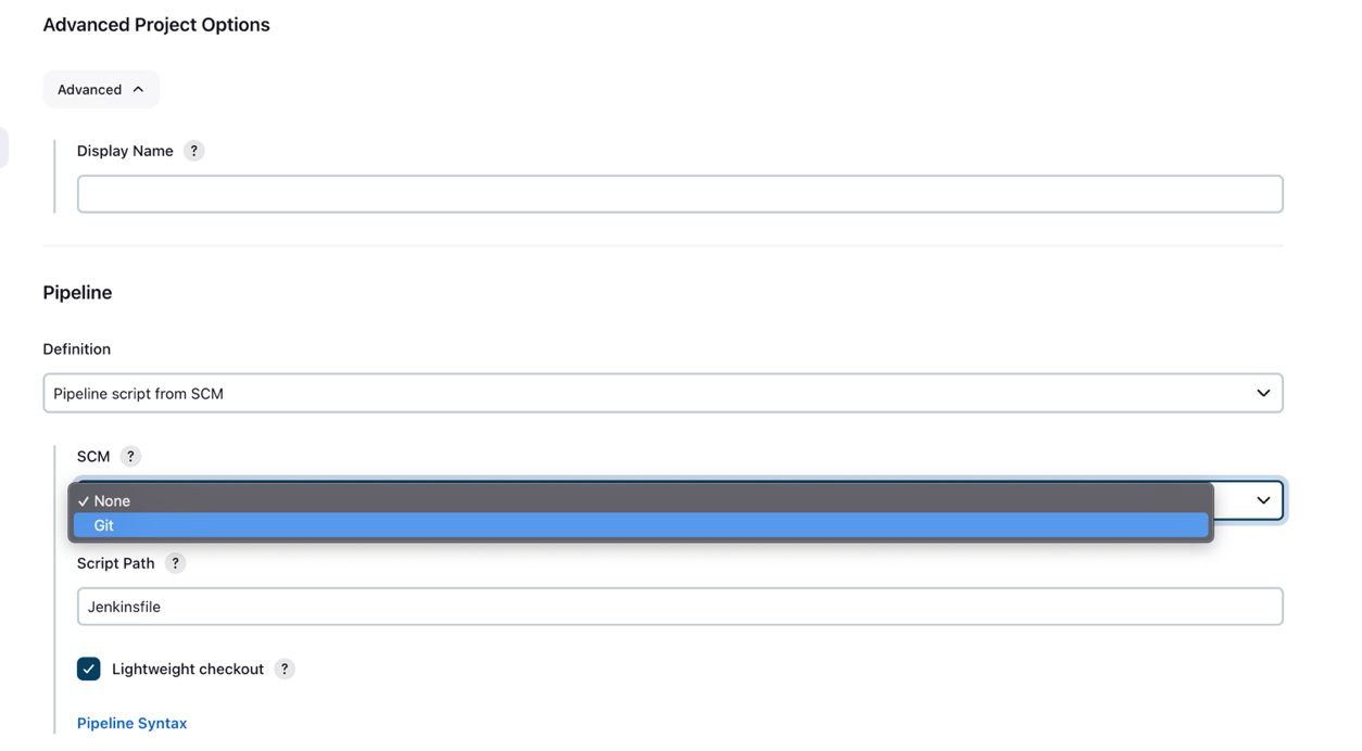 - Under Advanced Project Options, for Definition, select Pipeline script from SCM.