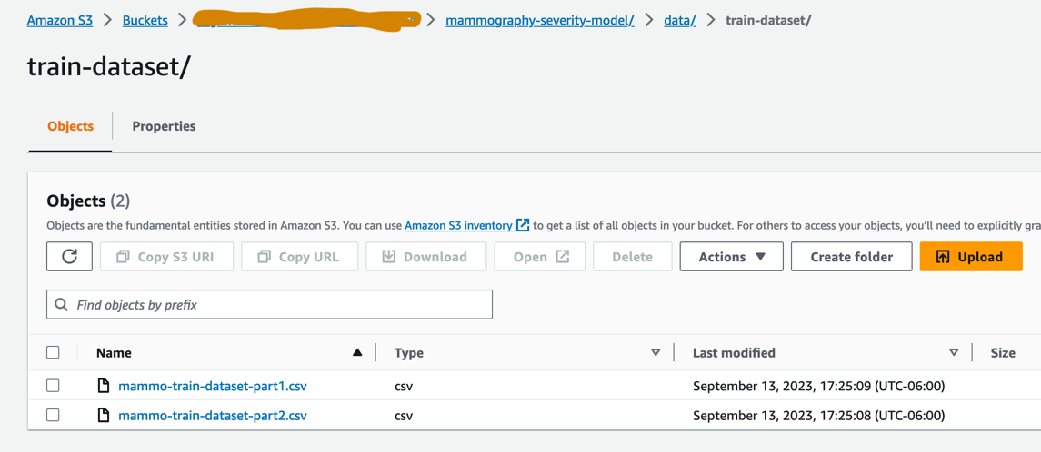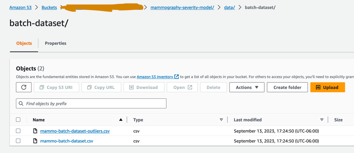 mammo-train-dataset-part1.csvunder the prefixmammography-severity-model/train-dataset, and upload the datasetsmammo-batch-dataset.csvandmammo-batch-dataset-outliers.csvto the prefixmammography-severity-model/batch-datasetof the S3 bucket created in the dev account: - Upload the datasets