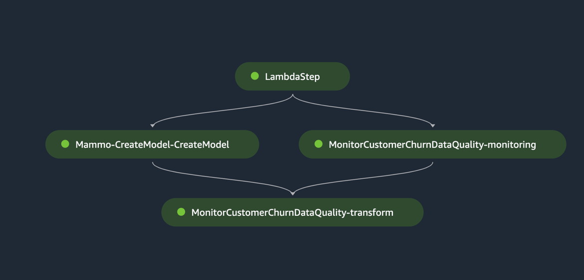 The following figure shows a successful run of the inference pipeline. The final step in the pipeline generates the predictions and stores them in the S3 bucket. We use MonitorBatchTransformStep to monitor the inputs into the batch transform job. If there are any outliers, the inference pipeline goes into a failed state.