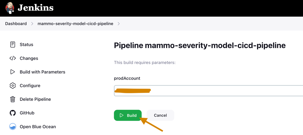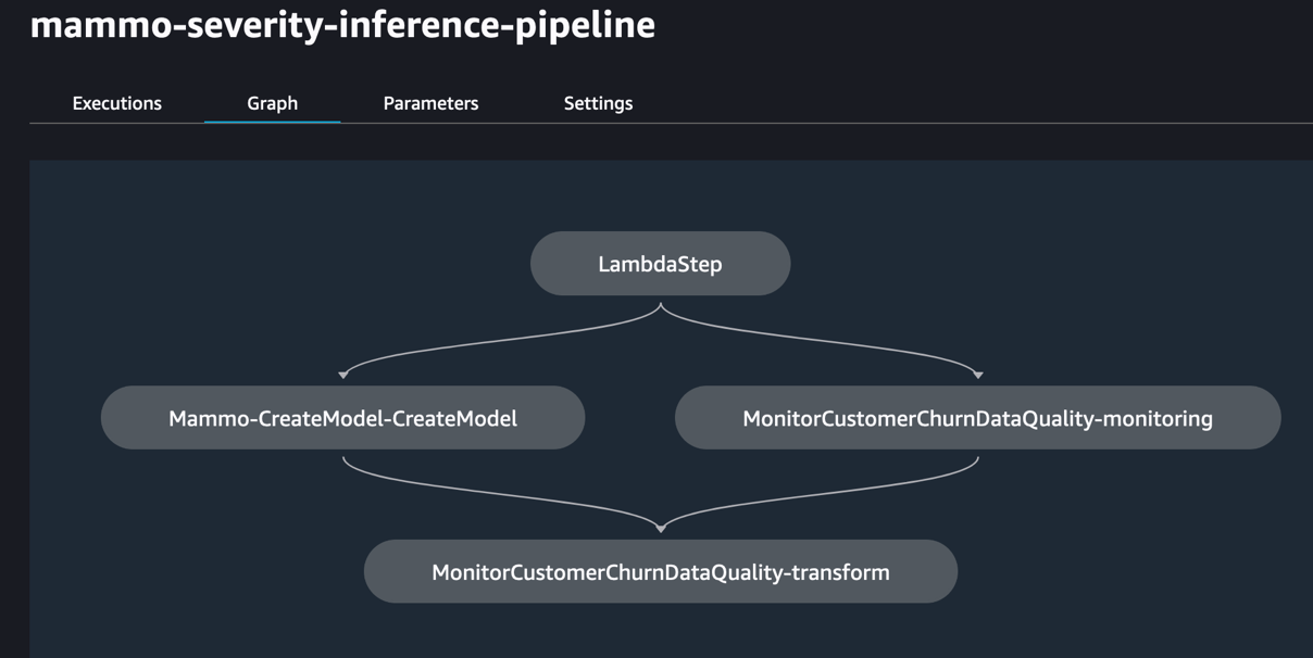 Run the pipeline via the SageMaker Pipelines console in the SageMaker Studio domain of the prod account, where the transform_input will be the S3 URI of the dataset without outliers (s3://<s3-bucket-in-prod-account>/mammography-severity-model/data/mammo-batch-dataset.csv).