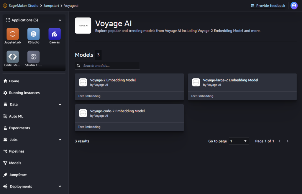 Voyage AI offers API endpoints for embedding models, making it seamless to integrate with other components of your RAG stack. The Voyage AI embedding models are available on AWS Marketplace and deployable as Amazon SageMaker endpoints within your account and VPC, eliminating security and compliance concerns. As part of SageMaker JumpStart, you can deploy Voyage AI embedding models with a few clicks and start running your RAG stack on AWS.