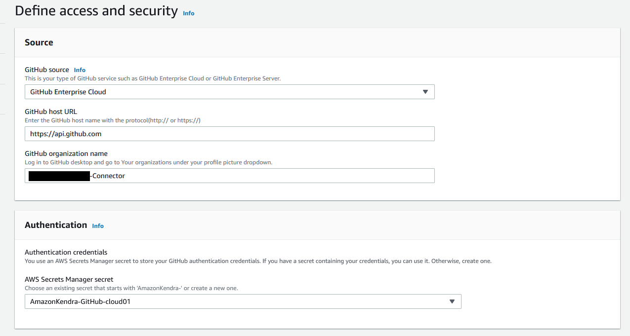 - On the Define access and security page, choose your GitHub source. Amazon Kendra supports two types of GitHub services: