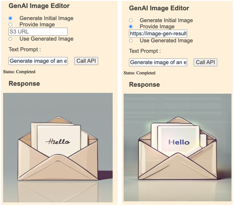 generate_image_with_bedrockfunction, uploads the new image to Amazon S3, and returns the file name and a pre-signed URL. - UseGenerated – It retrieves an image from a pre-signed S3 URL, generates a new image using the