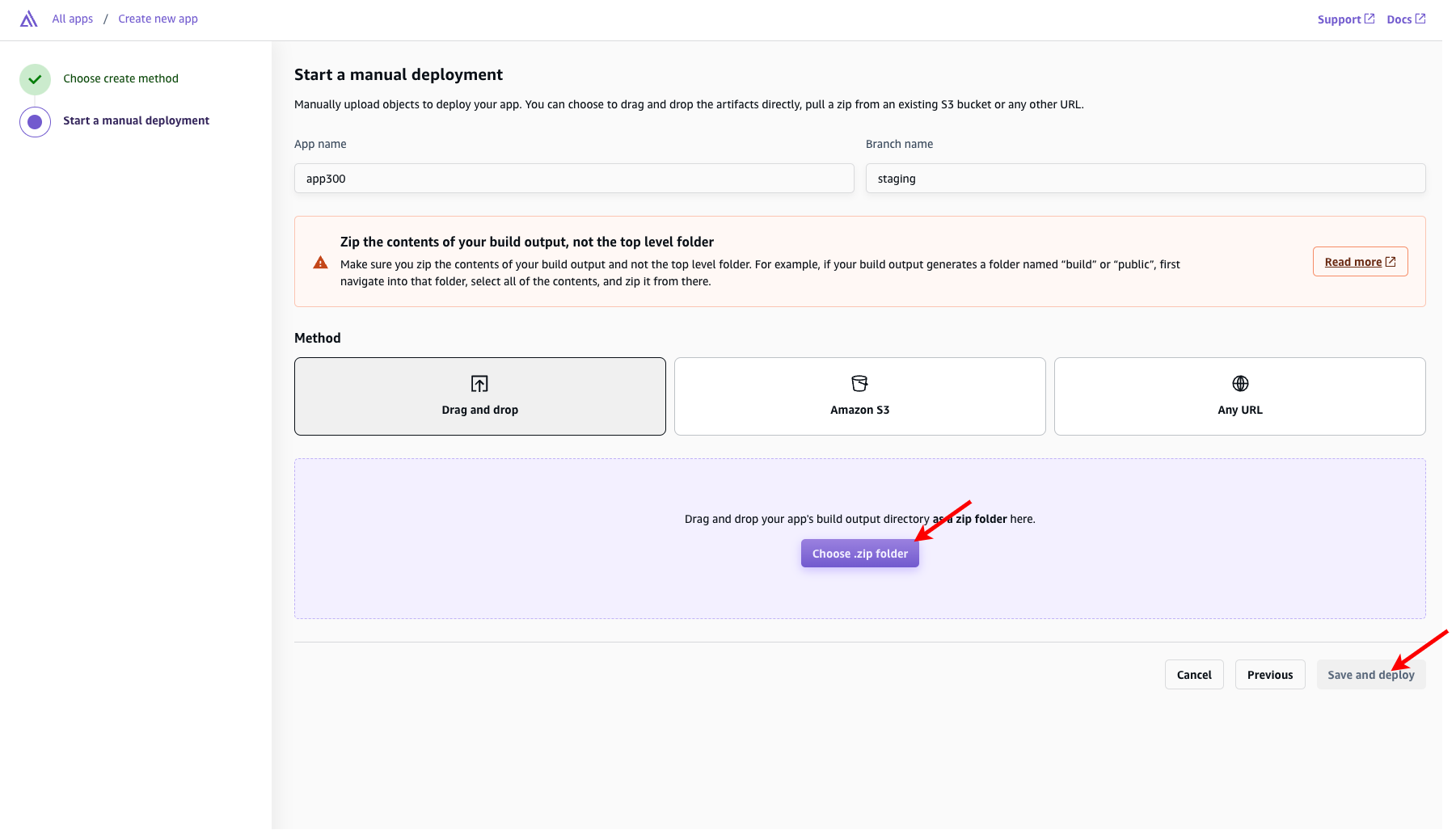 - Upload the compressed .zip file, and change the application name and branch name if preferred.