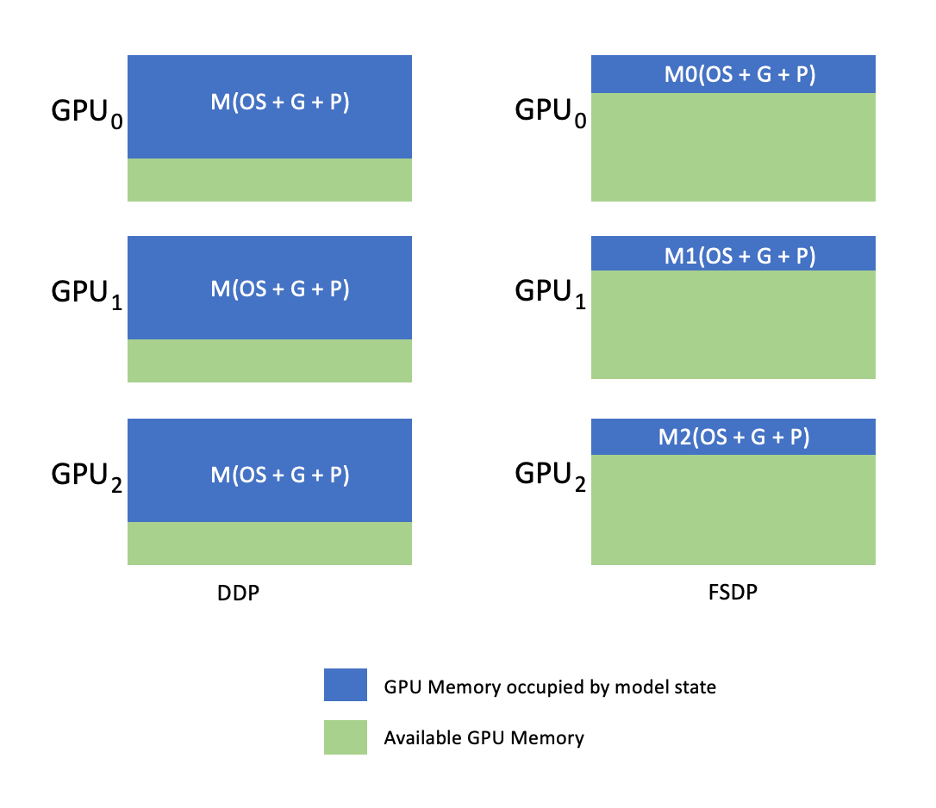 This is demonstrated in the following diagram, where in the case of DDP, each GPU holds a complete copy of the model state, including the optimizer state (OS), gradients (G), and parameters (P): M(OS + G + P). In FSDP, each GPU holds only a slice of the model state, including the optimizer state (OS), gradients (G), and parameters (P): M<partition number>(OS + G + P). Using FSDP results in a significantly smaller GPU memory footprint compared to DDP across all workers, enabling the training of very large models or using larger batch sizes for training jobs.