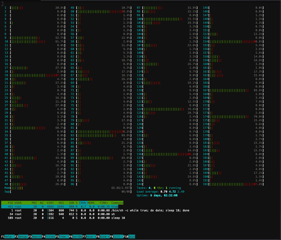 Thedaemonsetwill run a lightweight htop pod on each node. You can exec into any of these pods and run thehtopcommand: