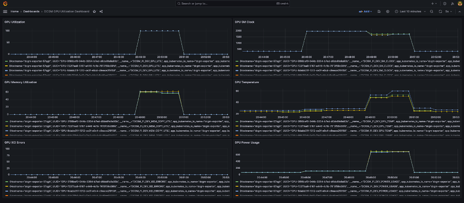 Now that you understand how your system works on the pod and node level, it’s also important to look at metrics at the cluster level. Aggregated utilization metrics can be collected by NVIDIA DCGM Exporter and Prometheus and visualized in Grafana.