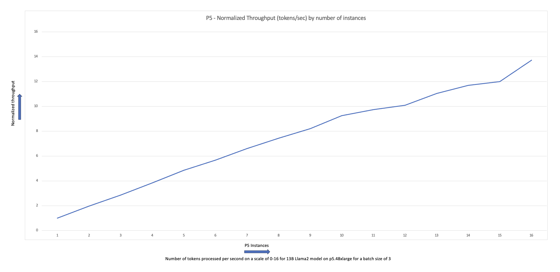 The following scaling chart shows that the p5.48xlarge instances offer 87% scaling efficiency with FSDP Llama2 fine-tuning in a 16-node cluster configuration.