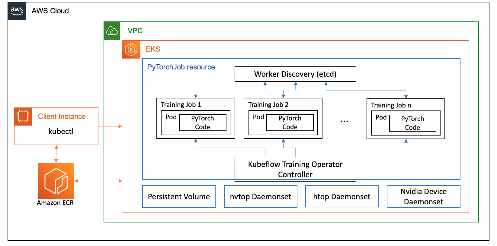 To run FSDP on Amazon EKS, we use the PyTorchJob custom resource. It requires etcd and Kubeflow Training Operator as prerequisites.