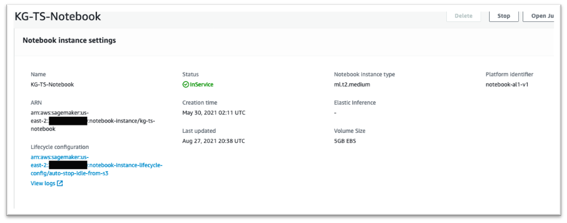 - From here, navigate back to your notebook instance. If the notebook instance is running, turn it off by selecting the notebook instance and choosing Stop on the top left corner.