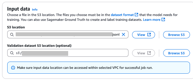 - Under Input data, specify the S3 locations for your training and validation datasets.