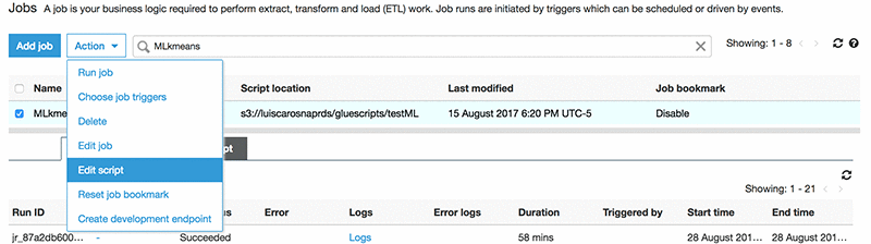 I’ll show you an AWS Glue job script that uses Spark machine learning K-means clustering libraries to segment a data set based on coordinates. The script performs a job by loading the green taxi data and adding a column indicating the cluster each row gets assigned to. The script saves the table to an Amazon s3 bucket (destination file) using parquet format. The bucket can be queried using Amazon Athena.