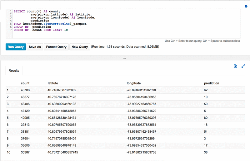 Let’s consider the problem of distributing the taxi rides dataset in 100 different groups (clusters) equally between all the registered pickup locations (given by the pickup_longitude and pickup_latitude columns). To solve this problem the AWS Glue script reads the input table, and then, using Spark machine learning libraries, it implements K-means with the number of clusters set to 100. Results are stored in an Amazon S3 bucket using parquet format so you can query them using Amazon Athena.
