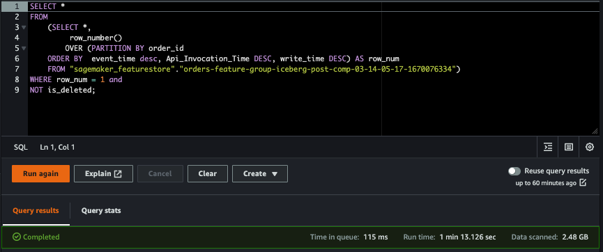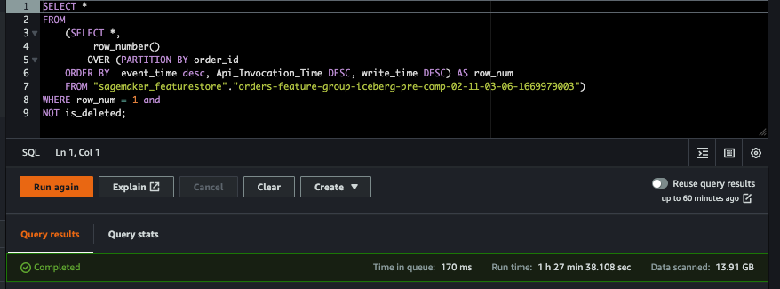 We run a query to select the latest snapshot without duplicates and without deleted records on the feature group orders-feature-group-iceberg-pre-comp-02-11-03-06-1669979003. Prior to compaction, the query took 1hr 27mins.