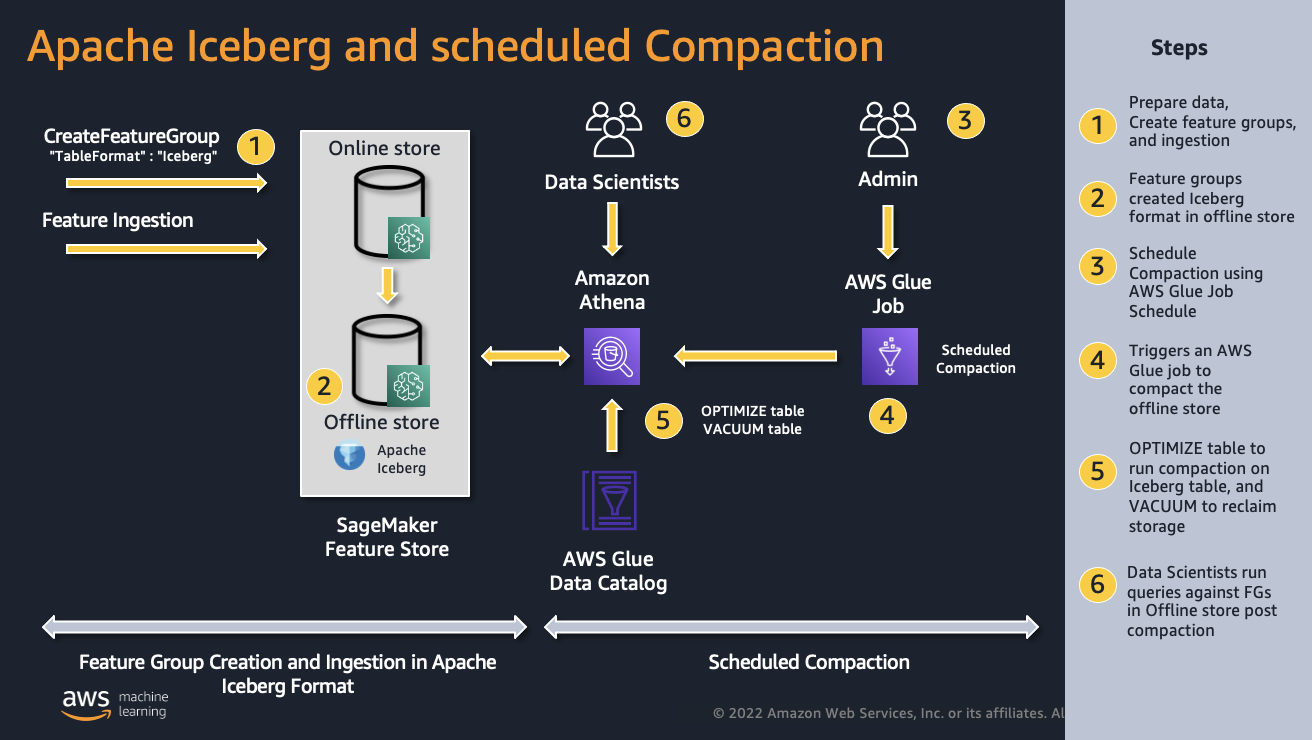 At a high level, you create a feature group using the Iceberg table format and ingest records into the online feature store. Feature values are automatically replicated from the online store to the historical offline store. Athena is used to run the Iceberg management procedures. To schedule the procedures, you set up an AWS Glue job using a Python shell script and create an AWS Glue job schedule.