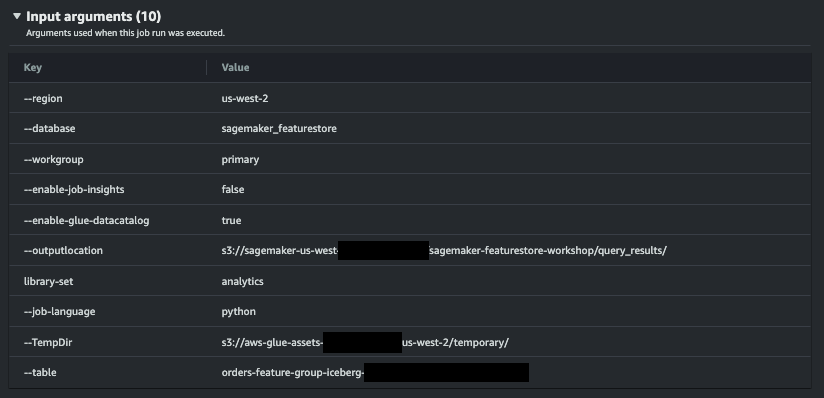 The script has been parametrized using the AWS Glue getResolvedOptions(args, options) utility function that gives you access to the arguments that are passed to your script when you run a job. In this example, the AWS Region, the Iceberg database and table for your feature group, the Athena workgroup, and the Athena output location results folder can be passed as parameters to the job, making this script reusable in your environment.