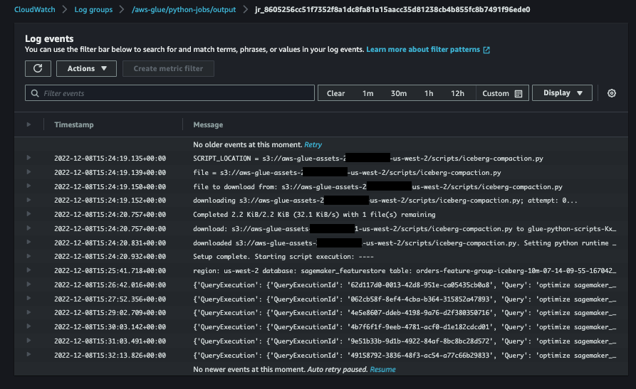 You can monitor job runs to understand runtime metrics such as completion status, duration, and start time. You can also check the CloudWatch Logs for the AWS Glue job to check that the procedures run successfully.