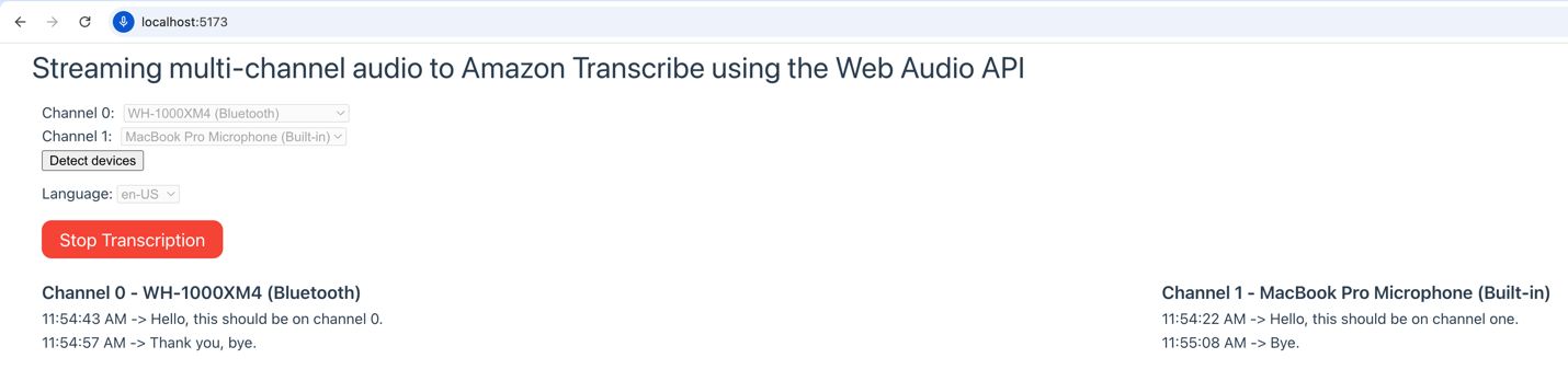 In this post, we guide you through how to use two microphones as audio sources, merge them into a single dual-channel audio, perform the required encoding, and stream it to Amazon Transcribe. A Vue.js application source code is provided that requires two microphones connected to your browser. However, the versatility of this approach extends far beyond this use case—you can adapt it to accommodate a wide range of devices and audio sources.