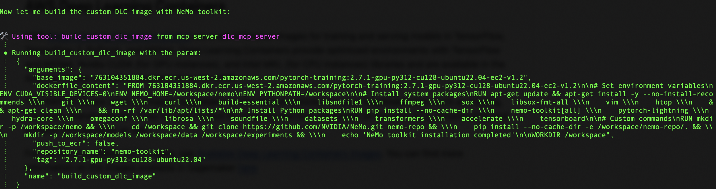 After the custom Dockerfile is created, the server starts building our custom DLC image. To achieve this, Amazon Q uses the build_custom_dlc_image tool in the image building module. This tool streamlines the process by setting up the build environment with specified arguments. This step transforms our base image into a specialized container tailored for NeMo-based AI development.