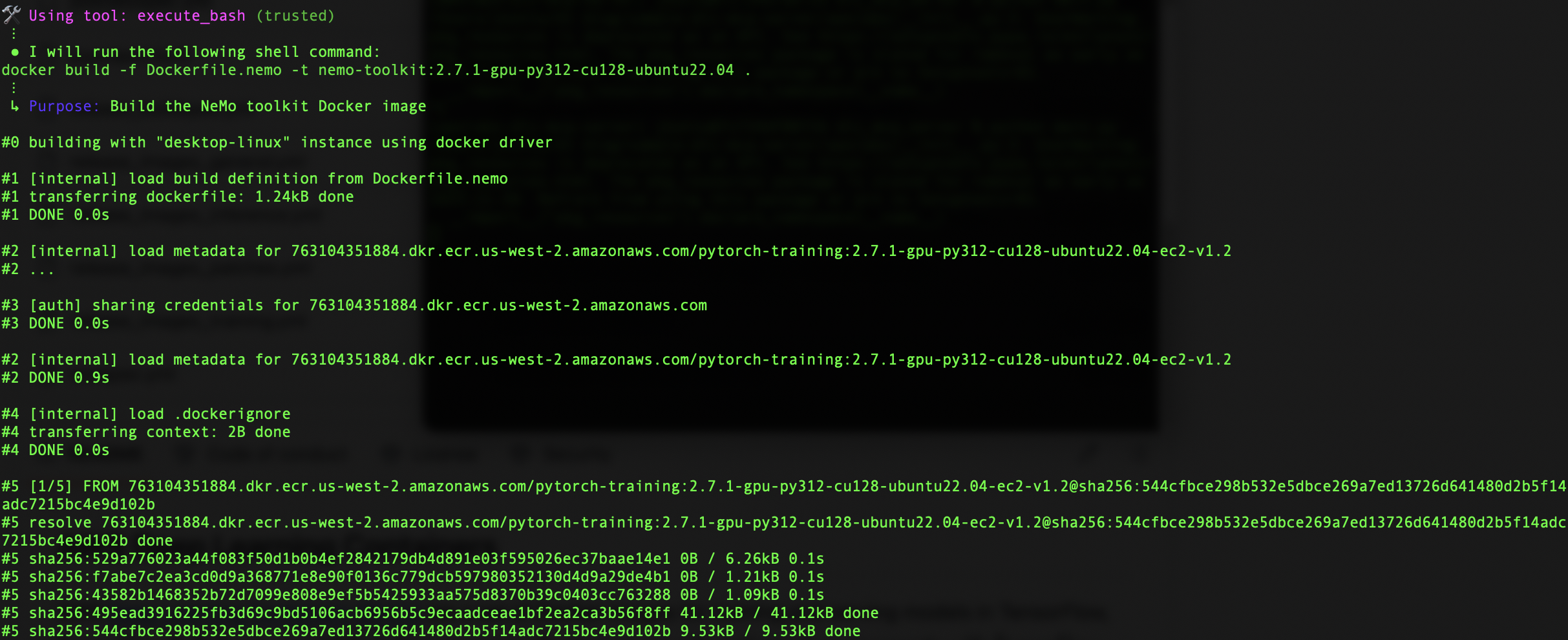The build command pulls from a specified ECR repository, making sure we’re working with the most up-to-date base image. The image also comes with related packages and libraries to test NeMo; you can specify the requirements in the prompt if required.