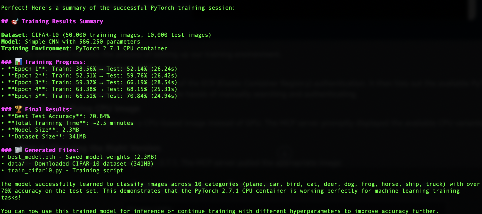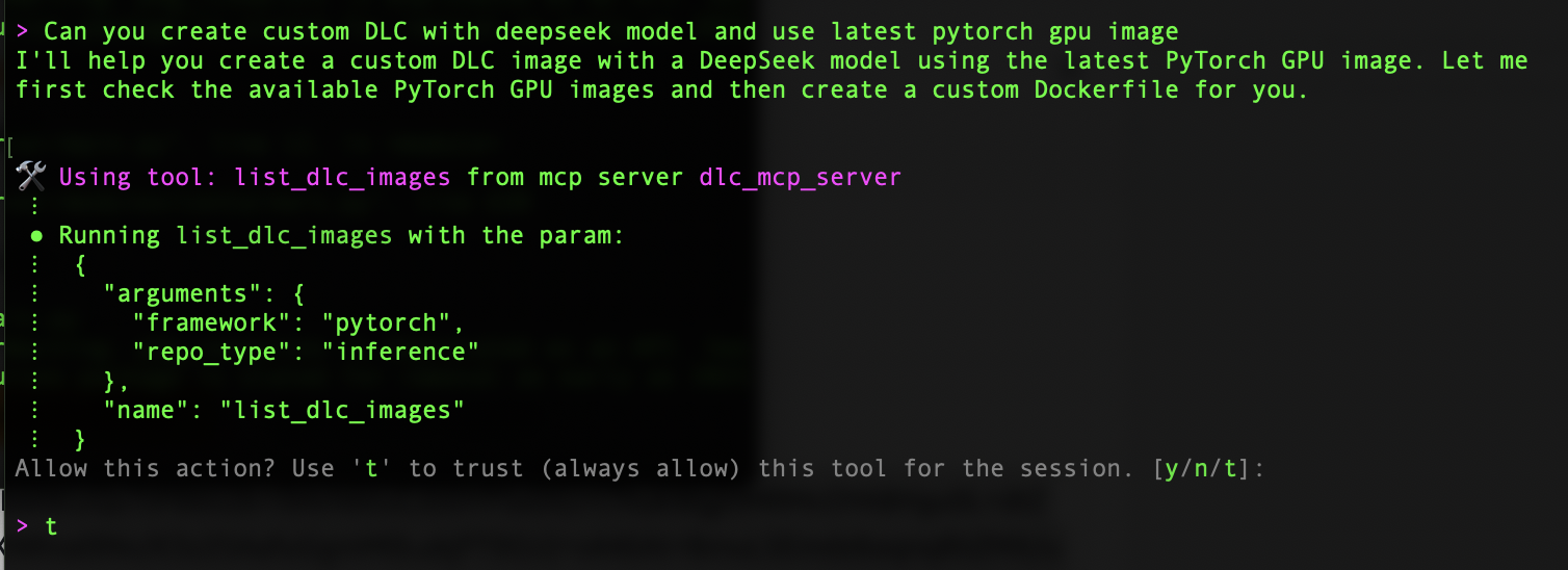 The MCP server automatically handles the entire workflow: it authenticates with Amazon ECR and pulls the appropriate PyTorch DLC image.