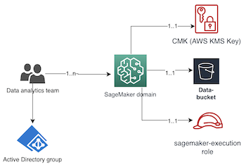Each data analytics team is able to request one or multiple SageMaker domains through the company’s internal self-service portal. This process of ordering a SageMaker domain is orchestrated through a separate workflow process (via AWS Step Functions). During this orchestration flow, an Azure Active Directory (AD) group for the data analytics team is provisioned with the AD group name corresponding to the domain name. The orchestration leads to a continuous integration and continuous deployment (CI/CD) pipeline deploying an AWS Cloud Development Kit (AWS CDK) app consisting of a SageMaker domain for the respective team.