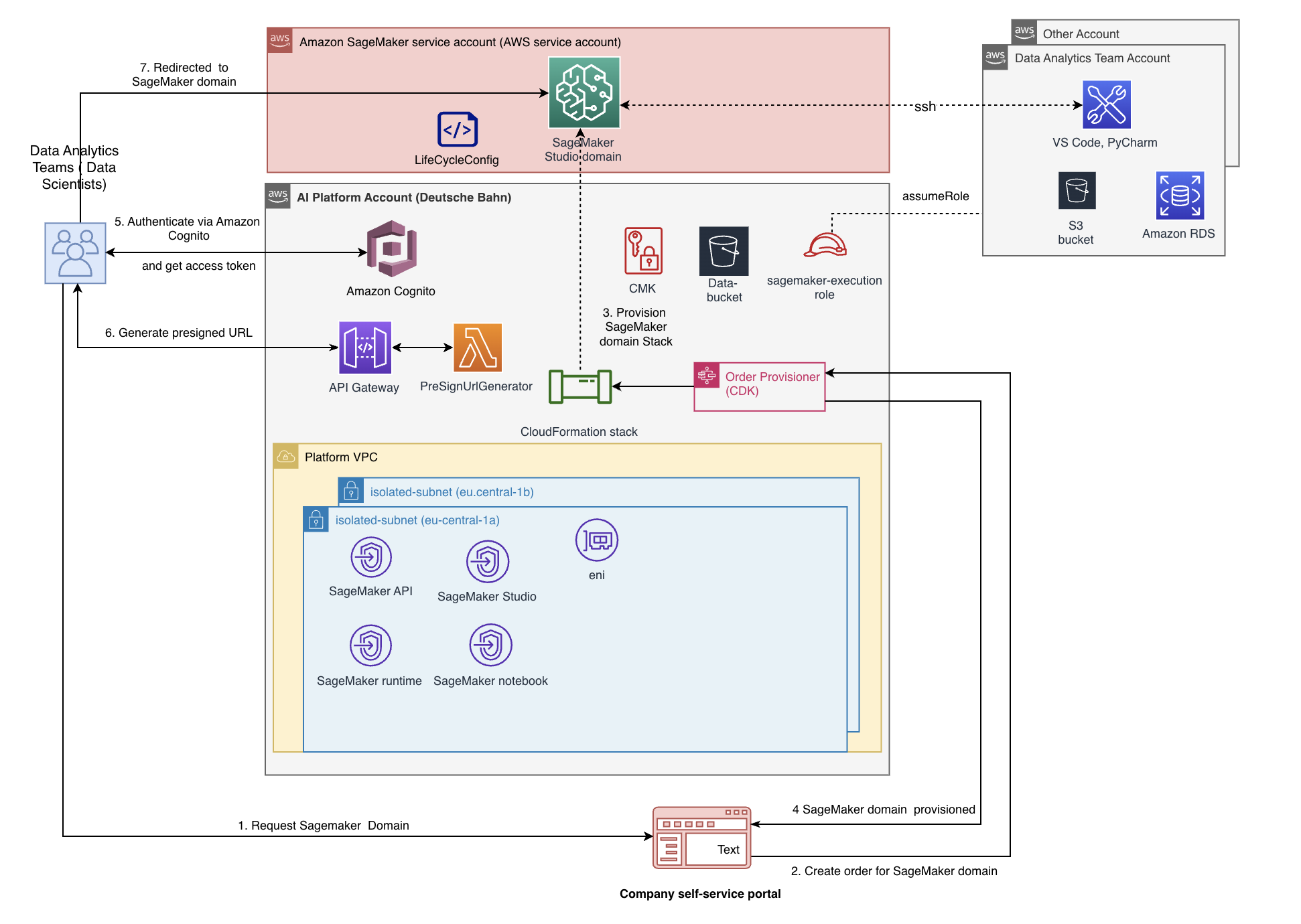 The post highlighted how Deutsche Bahn effectively used SageMaker Studio to revamp its AI platform, resulting in a scalable, automated, and manageable solution to support its diverse data analytics teams. This architecture features a central platform account, a self-service domain ordering process, and infrastructure provisioning using AWS CDK. The deployment process incorporates a CI/CD pipeline, ensuring the smooth delivery of SageMaker domains.