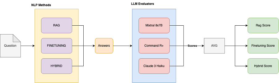 - LLM evaluator score: We use different language models from Amazon Bedrock to score the responses from RAG, fine-tuning, and Hybrid approaches. Each evaluation receives both the correct answers and the generated answers and gives a score between 0 and 1 (closer to 1 indicates higher similarity) for each generated answer. We then calculate the final score by averaging all the evaluation scores. The process is shown in the following figure.