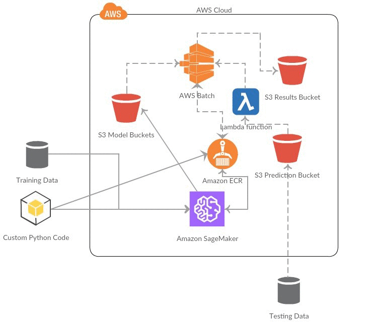 We first create all the static pieces of our architecture: the security policies, the Amazon S3 buckets, the compute environment and job queue, the AWS Lambda functions, and the AWS Lambda triggers. We then place our training and prediction code into a Docker container that we’ll upload to Amazon Elastic Container Registry (Amazon ECR). After we have a working container, we can use Amazon SageMaker to quickly train our classification model.