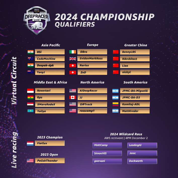 Tens of thousands raced in Virtual Circuit monthly qualifiers from March to October in an attempt to earn one of only four spots from six regions (24 spots in all), making qualifying for the 2024 Championship one of the most difficult to date. Finalists were tested on consistent performance over consecutive laps rather than “one lucky lap,” making the championship a true test of skill and dashing the championship dreams of some of the most prolific racers, community leaders, and former championship finalists during the regular season. When the dust settled, the best of the best from around the world secured their spots in the championship alongside returning 2023 champion FiatLux (Youssef Addioui) and 2023 Open Winner PolishThunder (Daryl Jezierski). For the rest of the hopefuls, there was only one more opportunity—the WildCard Last Chance qualifier on the Expo floor at re:Invent 2024—to gain entry into the final championship and etch their names in the annals of DeepRacer history.