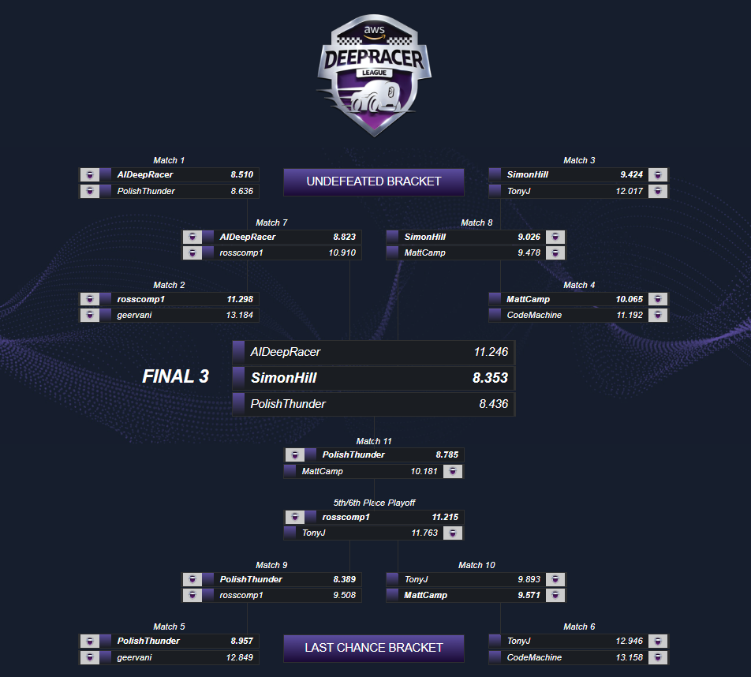 With one final spot in the top three up for grabs, five-time championship finalist and eighth-seed PolishThunder, who was stunned into defeat in the very first matchup of the day, mounted an equally stunning comeback as he bested fifth seed geervani in match five and then knocked out fellow DeepRacer veteran, friend, and fourth-seed rosscomp1 with a remarkable 8.389-second time. MattCamp regained his mojo to beat TonyJ in match 10, setting him and PolishThunder up for a showdown to see who would go up against SimonHill and AIDeepRacer in the finale. Undaunted, PolishThunder toppled the Wildcard winner once and for all, taking him one step closer to being the DeepRacer Champion.