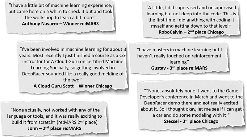 Participants in the league vary in their ability and experience in machine learning. Re:MARS, not surprisingly brought some speedy times, but developers there were still able to learn something new and build on their existing skills. Similarly, our winner from Chicago had some background in the field, but our 3rd place winner had absolutely none. The league is open to all and can help you reach your machine learning goals. The pre-trained models provided at the track make it possible for you to enter the league without building a model, or you can create your own from scratch in one of the workshops held at the event. And new this week is the racing tips page, providing developers with the most up to date tools to improve lap times, tips from AWS experts, and opportunities to connect with the DeepRacer community. Check it out today and start sharing your DeepRacer story!
