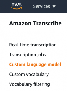 We use this training data to train our CLM in Amazon Transcribe. To do so, we can use the AWS Management Console, the AWS Command Line Interface (AWS CLI), or the AWS SDK. The methodology shown in this post uses the console.