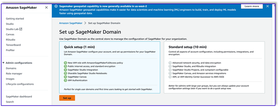 - On the SageMaker console, access an existing SageMaker Studio domain or create a new one to access Amazon Bedrock from a SageMaker notebook.