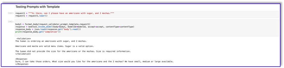 RequestValidation prompt verifies the order with the menu item and lets the customer know via Amazon Lex if there’s something they want to order that isn’t part of the menu and will provide recommendations. The prompt also performs a preliminary validation for order completeness.