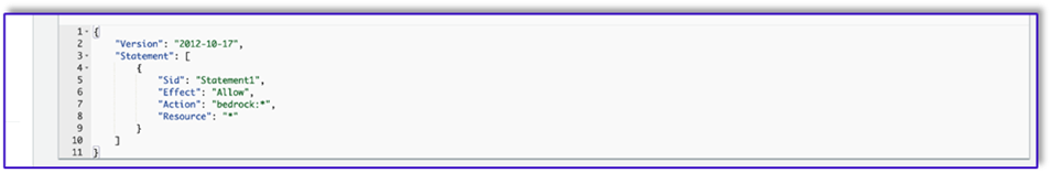 Finally, you create the following policy and later attach it to any role accessing Amazon Bedrock: