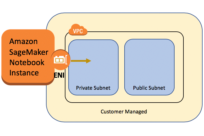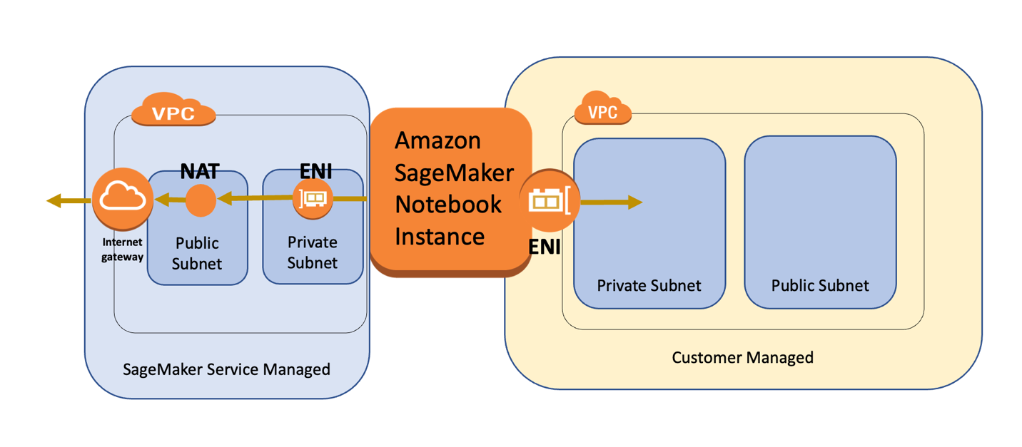 In this configuration, all the traffic goes through the single network interface. The notebook instance is running in an Amazon SageMaker managed VPC as shown in the above diagram. - Customer attached VPC with direct internet access (2 network interfaces)
